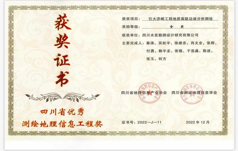經四川省測繪地理信息學會和四川省地理信息產業協會聯合評選認定,水發集團設計公司測繪分院完成的“引大濟岷工程地質高陡邊坡分析測繪”和“亭子口灌區工程新市支渠測量工程”兩個項目分別榮獲“2022年四川省優秀測繪地理信息工程獎”金獎和銅獎。
