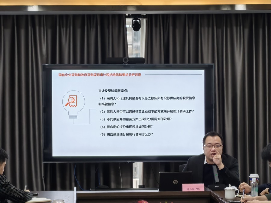 為提升投資公司及下屬企業的法律合規意識,降低日常工作中法律合規風險,為公司經營發展保駕護航,11月30日,投資公司邀請法律顧問開展“國有企業采購工作常見法律風險分析及案例講解”法律講座。
