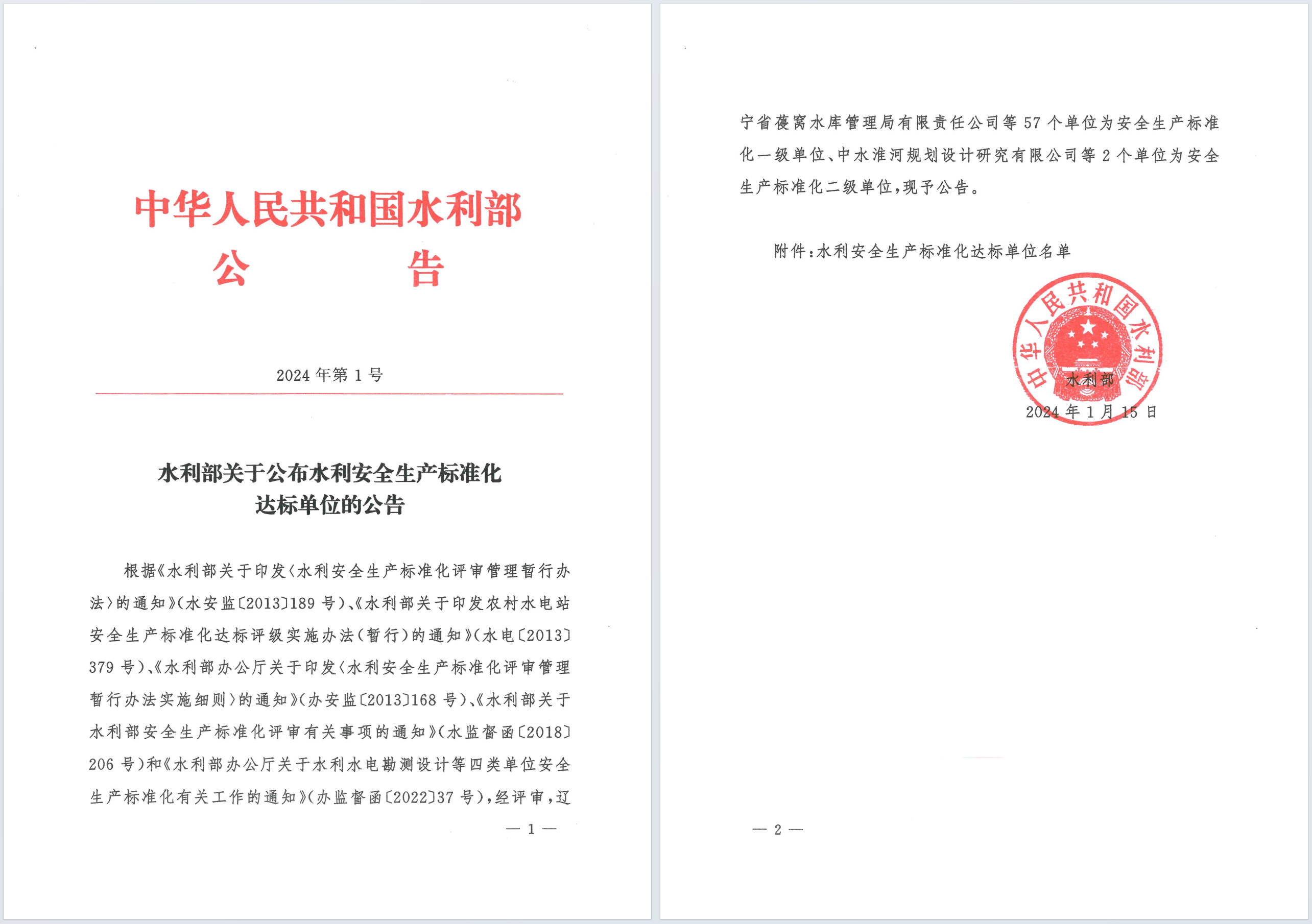 1月15日,集團安全生產標準化建設再傳喜訊,向家壩灌區公司被水利部評為“水利安全生產標準化一級達標單位”,成為集團獲此殊榮的第二家下屬企業。