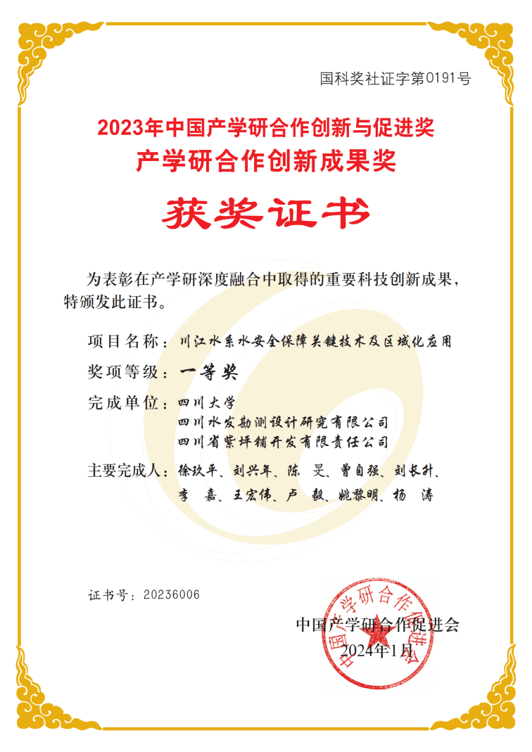 近日,由中國(guó)產(chǎn)學(xué)研合作促進(jìn)會(huì)主辦的第十五屆中國(guó)產(chǎn)學(xué)研合作創(chuàng)新大會(huì)在北京隆重舉行。會(huì)議對(duì)2023年在產(chǎn)學(xué)研深度融合等方面作出貢獻(xiàn)的先進(jìn)單位和個(gè)人進(jìn)行了頒獎(jiǎng)表彰,由四川水發(fā)設(shè)計(jì)公司聯(lián)合四川大學(xué)、四川省紫坪鋪開(kāi)發(fā)有限責(zé)任公司完成的項(xiàng)目“川江水系水安全保障關(guān)鍵技術(shù)及區(qū)域化應(yīng)用”榮獲2023年產(chǎn)學(xué)研合作創(chuàng)新成果一等獎(jiǎng)。這是該公司首次斬獲該榮譽(yù),也是其大力發(fā)展科技創(chuàng)新的重要成果,彰顯了集團(tuán)在水安全保障領(lǐng)域開(kāi)展高質(zhì)量產(chǎn)學(xué)研創(chuàng)新協(xié)同的創(chuàng)新成果。