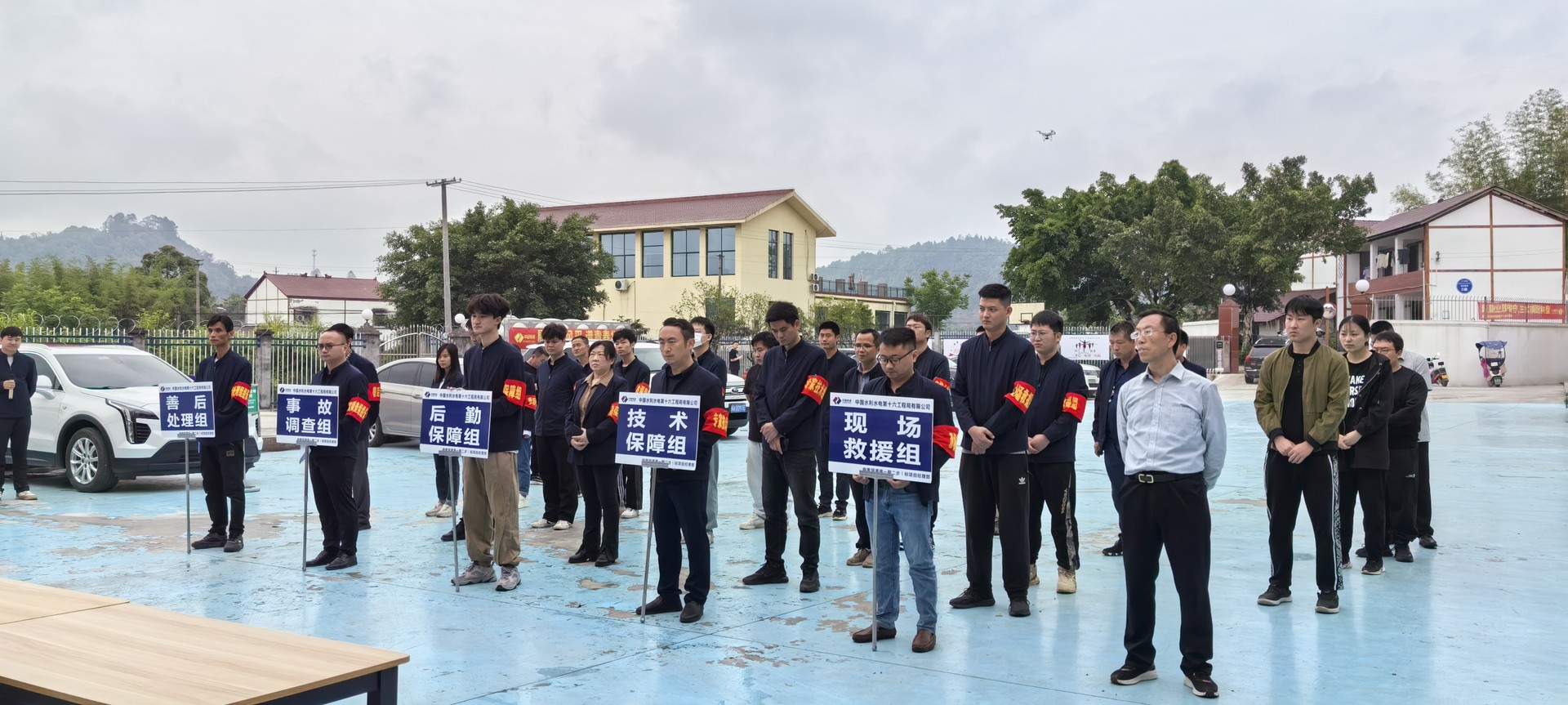 演練模擬營地后方邊坡因強降雨發生出現邊坡坍塌事故,防洪度汛現場指揮部收到消息后,立即作出全員撤離、組織救援的指令。技術保障組、現場救援組、后勤保障組按照應急預案第一時間出動開展救援。